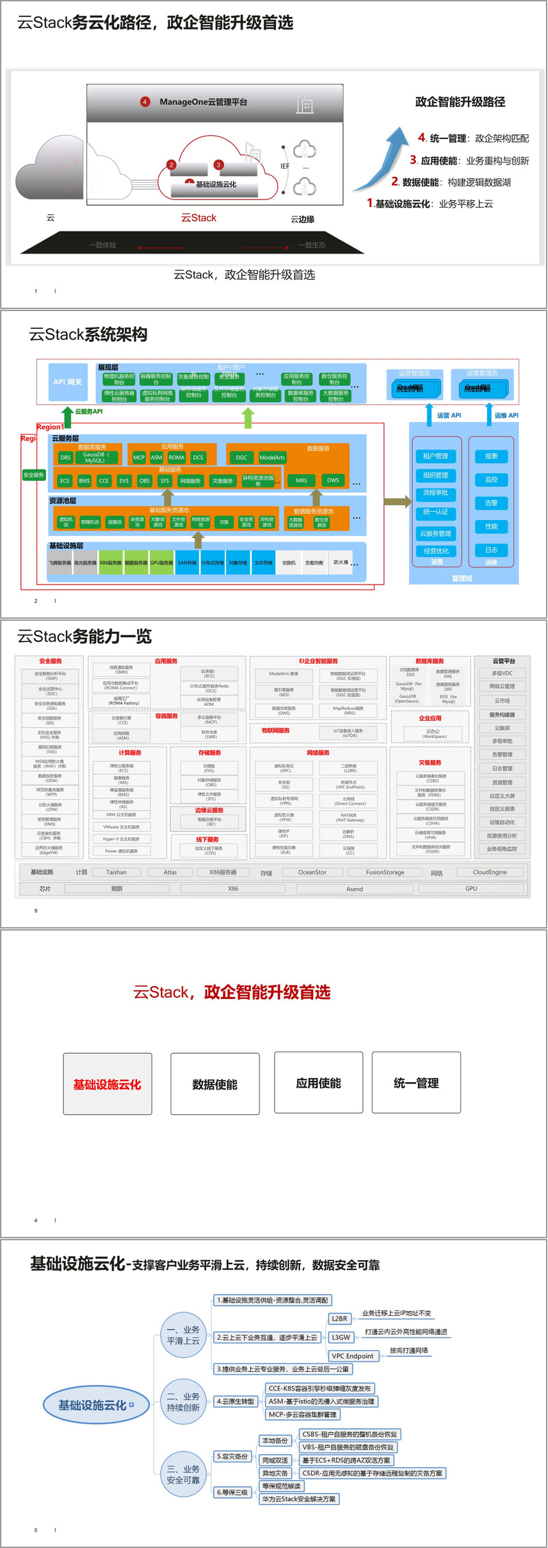 云Stack的整体架构设计以“基础设施云化、数据使能、应用使能、统一管理”四大核心能力为支柱,构建起一个层次清晰、能力全面的数字底座。在基础设施层面,方案支持X86与鲲鹏架构的多元算力融合,提供虚拟机、容器、物理机等多种资源形态,并通过云内云外全互联网络方案,实现业务IP地址不变的平滑迁移。在统一管理方面,ManageOne云管理平台实现了对多资源池、多区域、多云环境的集中管控。在安全架构上,方案