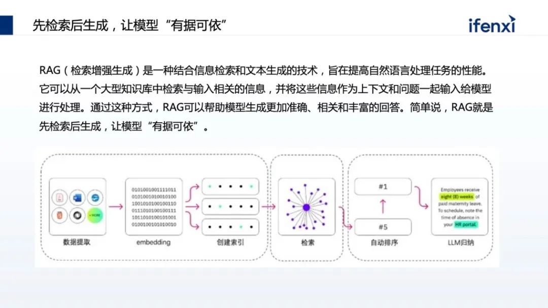RAG 其实在大模型之前就已经出现,它的核心能力是先汇集企业知识,再做索引。在提问时,根据问题在企业知识里找最相关的数据,进行有效排序,结果体现哪些最相关、哪些次相关,把一部分数据交给大模型,这是一个非常典型的让大模型有据可依的回答过程。