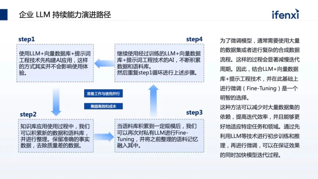 这其实就是企业落地大模型的三步骤,第一步就是去走 RAG,落地低门槛的知识库,第二步 RAG 积累数据,第三步有了数据然后去微调模型。