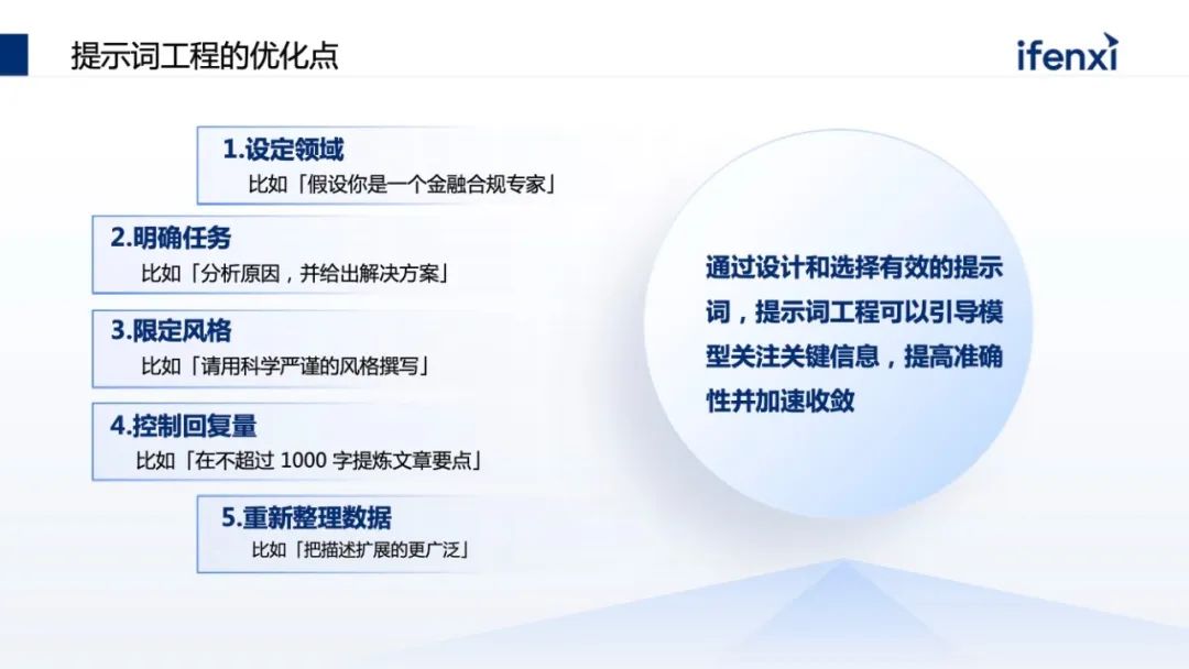 第一点是设定领域,给大模型圈定个范围。 在这个领域里找更好的答案。比如让大模型回答问题时,首先告诉大模型是一个金融的合规专家,这时它知道问题在金融领域并且非常严谨。