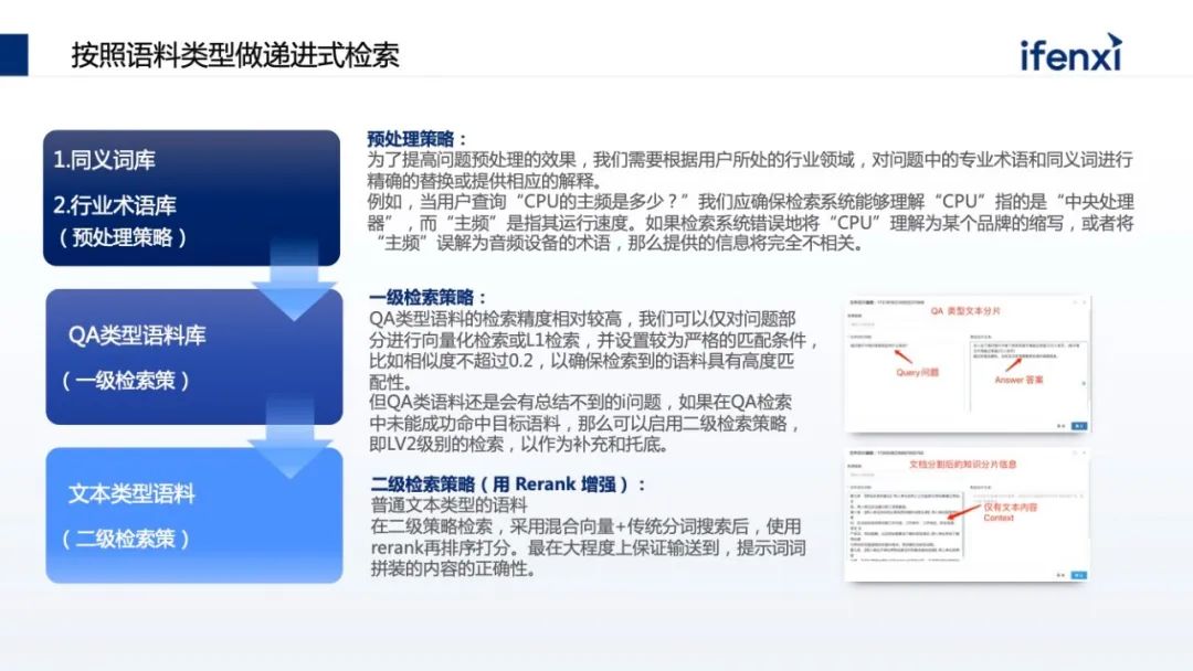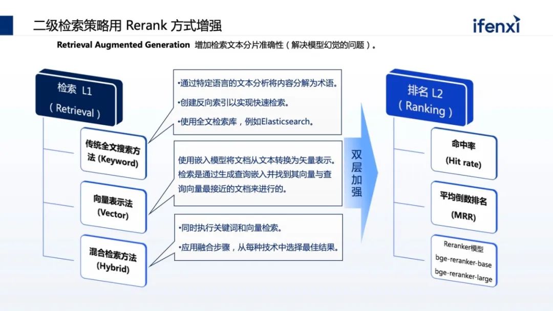 二级检索使用综合排序。 常见的二级监测里,大家往往把知识先存到向量数据库里,在向量数据库里找近似的。但有个问题,向量数据库更多是在语义的近似度或相近语义的场景找,某种程度上会丢失一些隐秘信息。过去在全文检索里做了优化,像关键词查询,这些优化能力在数据库里会丢失掉,所以使用了综合查询。从数据库里找到语义相近的,同时到权威检索库里根据关键字找出最相近的,然后去做重新排序的过程,把不同的结果,根据特定的算法重新排序。