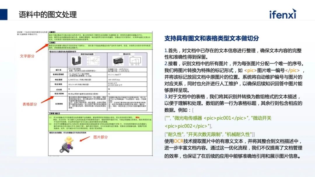 第一步预处理阶段,把图片提取出来,用编号替代原来文件的位置。同时告诉大模型在做内容组织的时候,希望保留图片的编号和标识,那在回复时,会保留原始文件的图片编号。第二步可以对图片进行 OCR 的识别, 把图片有意义的内容拆解出来,补充回原来图片的占位符上。占位符不仅是一个编号,同时具备了一种文档的内容,这样在大模型的理解上会更有优势。