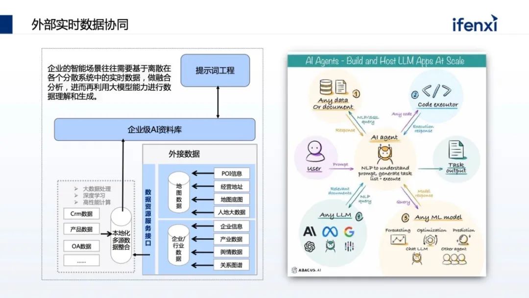企业很多数据是离散在系统上,甚至有些需要实时数据,这会导致大模型知识库本身的语料建设出现滞后性。这需要从企业系统里找到实时数据进行组装,这里涉及 Agent 的方式。所以在讲大模型使用时,大家会使用两种方式同时叠加,一方面用 RAG 做检索内容增强,另外一方面通过 AI agent 拿到实时数据,把实时数据补充到原来的生成上。