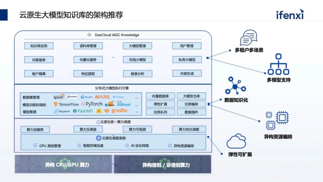 架构分为三层,最下面一层是算力调度层,把企业现有的例如 CPU 资源、GPU 资源、NV的卡,或者昇腾优秀的国产 GPU 卡,都管理和调度编排起来。中间是大模型的执行层,做 RAG 整体的流程,以及如何将大模型的推理与 RAG 流程结合起来。这个过程将企业现有数据变成大模型可认识的知识,进而跑通知识库的整个 RAG 流程。再往上是面向知识库场景建设,知识库看上去是统称的场景,但在企业落地时会有不同