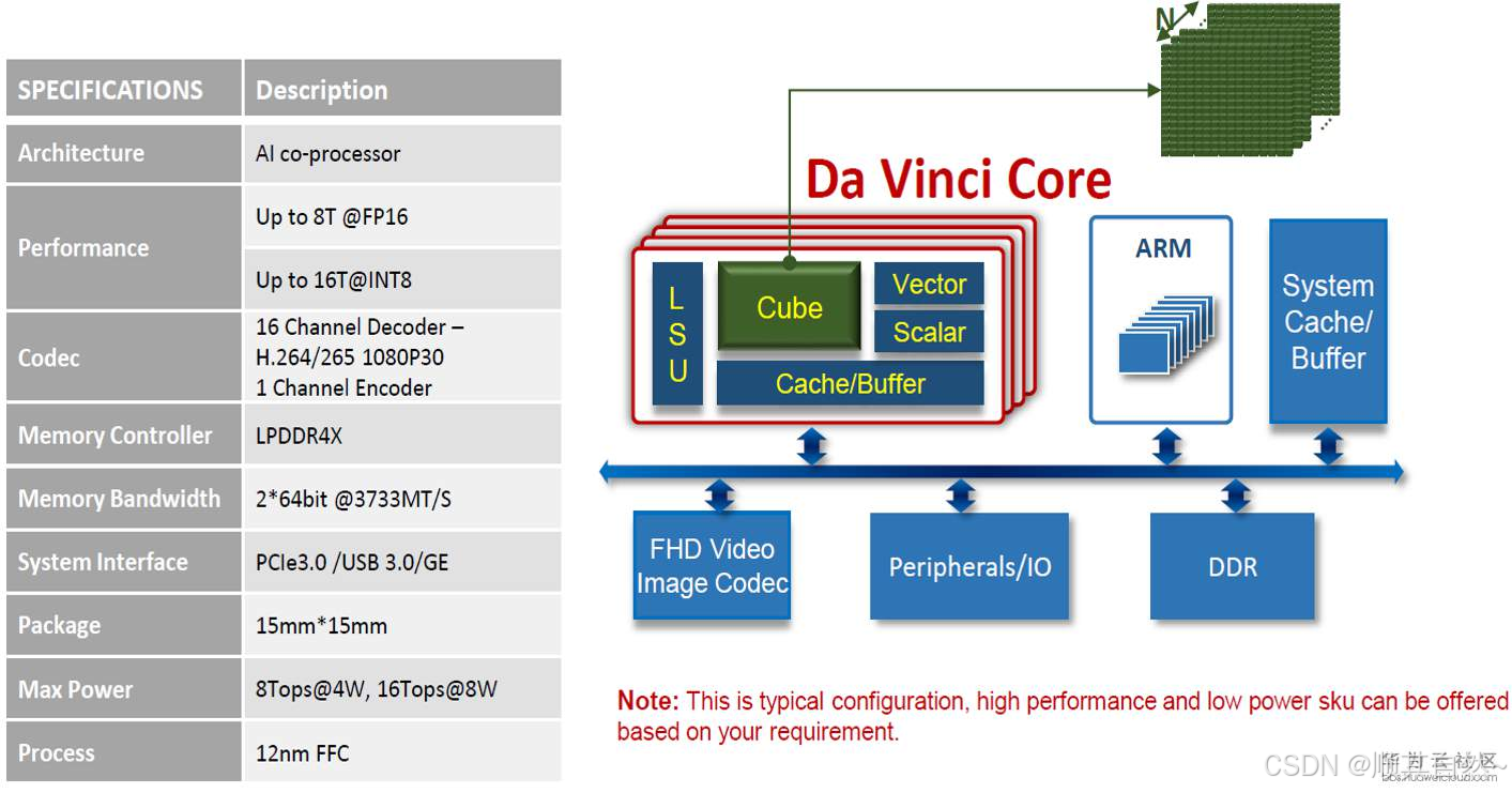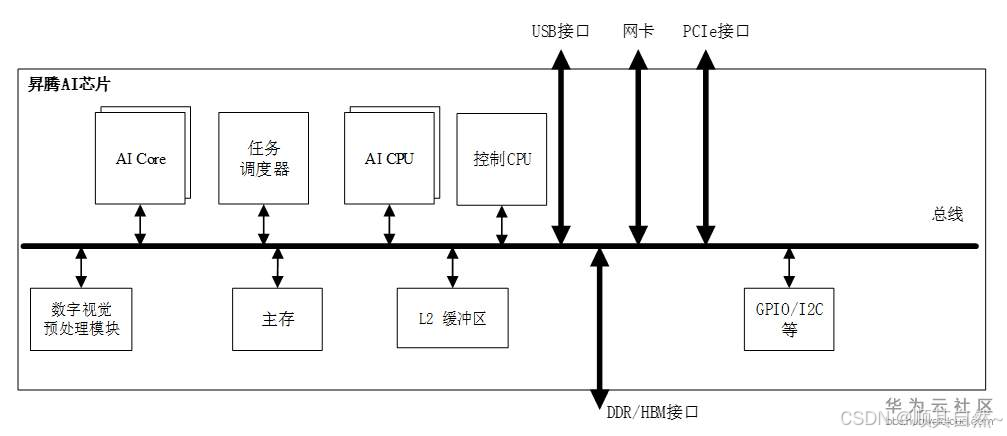 8)Cache & Buffer:SOC片内有层次化的memory结构,AI core内部有两级memory buffer,SOC片上还有8MB L2 buffer,专用于AI Core、AI CPU,提供高带宽、低延迟的memory访问。芯片还集成了LPDDR4x控制器,为芯片提供更大容量的DDR内存。