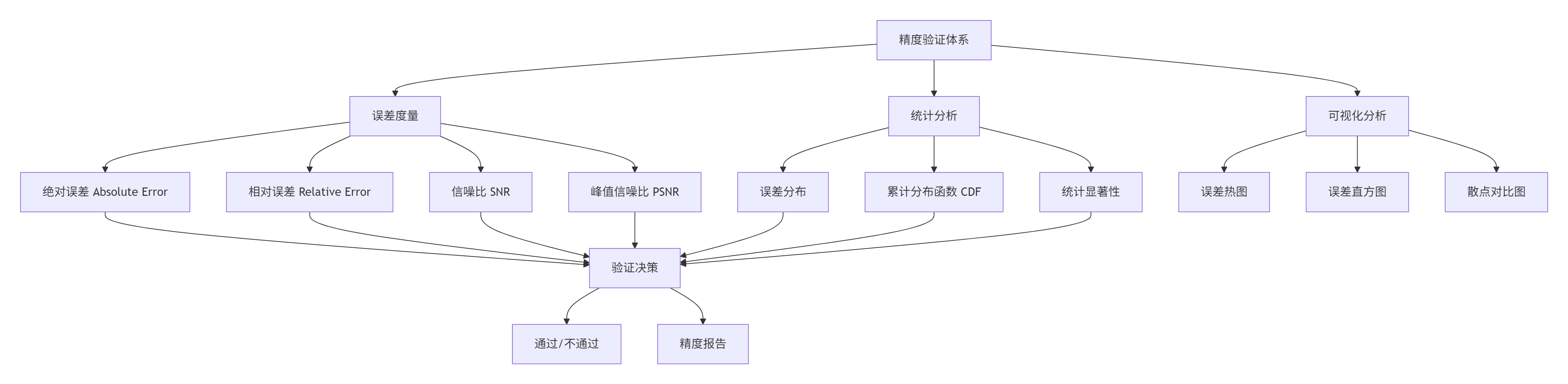 精度验证不是简单的"相等判断",而是需要考虑绝对误差、相对误差、信噪比、误差分布等多个维度。