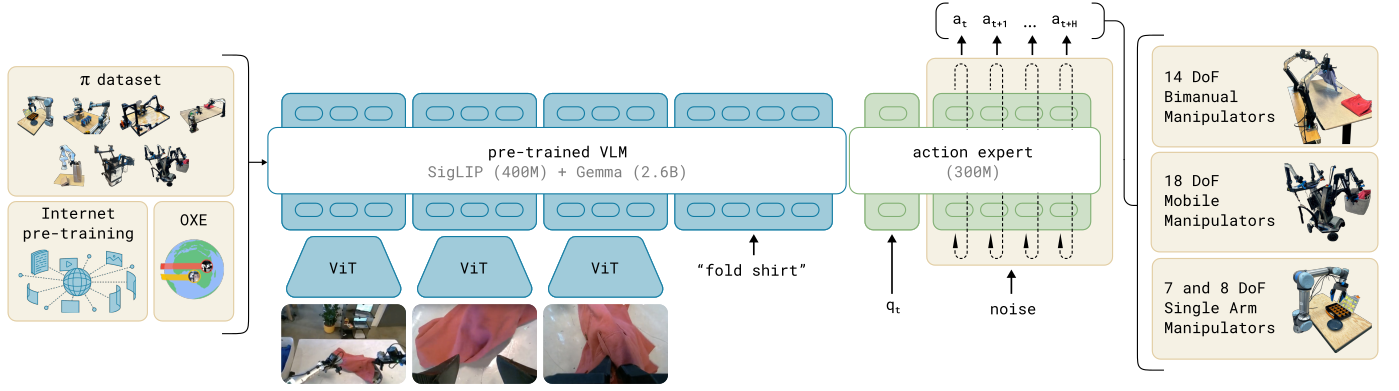 pi0是一个视觉-语言-动作(VLA)模型,专为通用机器人控制而设计。它基于预训练的视觉语言模型(VLM),结合流匹配(flow matching)机制,能够生成高频连续动作,实现对复杂、灵巧机器人任务的精准控制。整合OXE开源数据集和自有数据集,总计超过10,000小时机器人操作数据。在叠衣服、桌面清理、装盒等复杂任务上表现优异,零样本和微调设置下均显著优于现有基线方法(OpenVLA、Octo、ACT等)。成功完成5-20分钟的长时序多阶段任务,展现出强大的鲁棒性和泛化能力。pi0的模型架构图如下图所示: