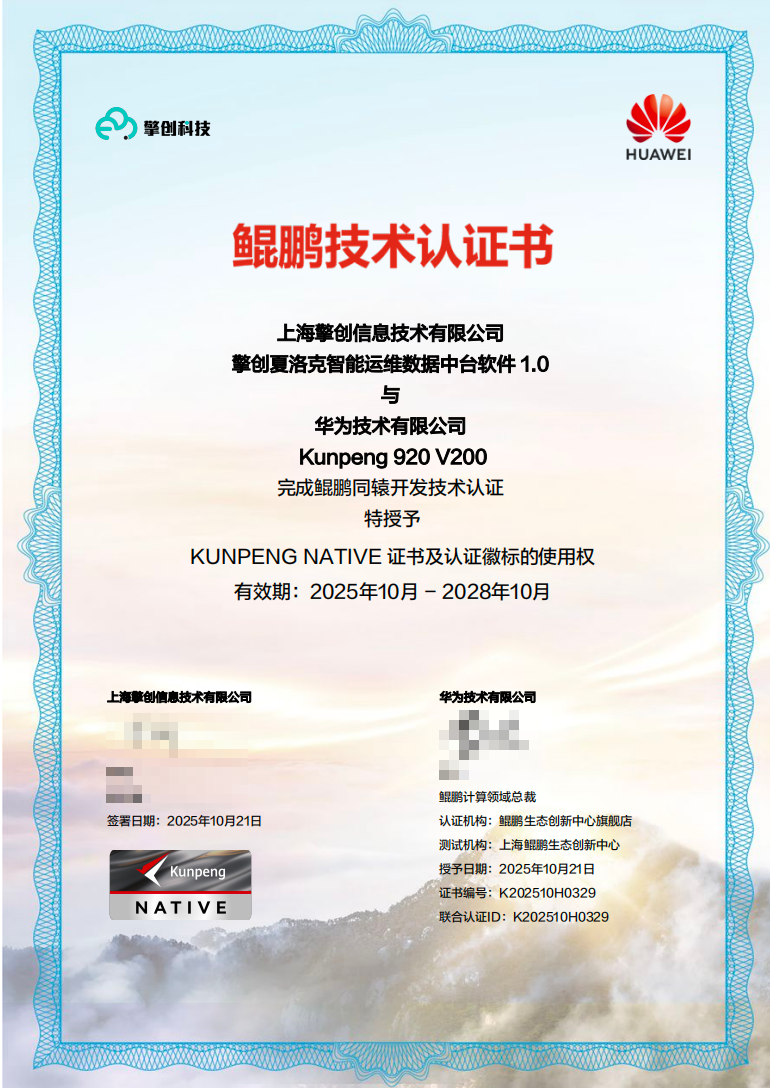 与此同时,擎创夏洛克智能运维数据中台软件正式通过华为KUNPENG NATIVE最高级别认证!标志着双方在技术共创与生态合作领域迈入全新阶段!