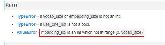 我们看报错信息,在ValueError中,写到padding_idx in Embedding should be in range of [0, 2000), but got 10000 with type int.,意思是Embedding 算子中的padding_idx’的值需要在0到2000之间, 但是得到的了10000。结合官网对Ebedding算子的用法说明, 发现对padding_idx已有明确规定, 其值需要满足在0到vocab_size之间: