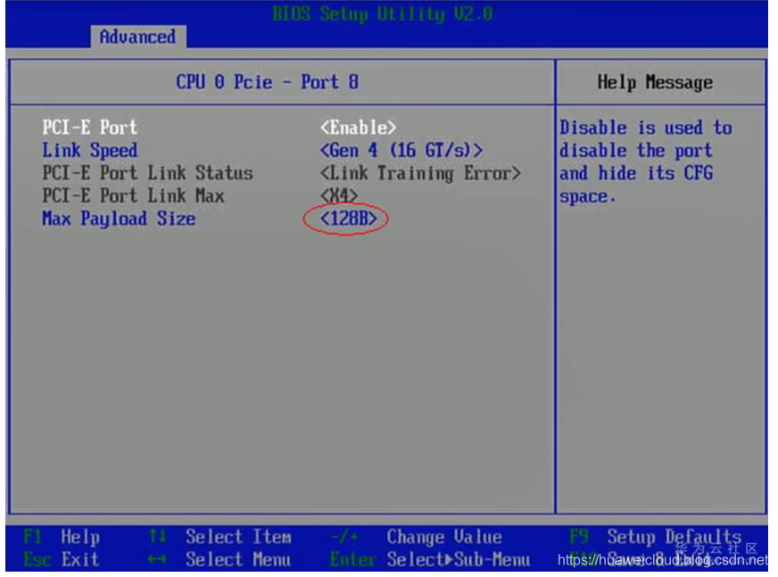 按照B 进入BIOS界面的步骤进入BIOS,选择“Advanced > Max Payload Size”,将“Max Payload Size”的值设置为“512B”。