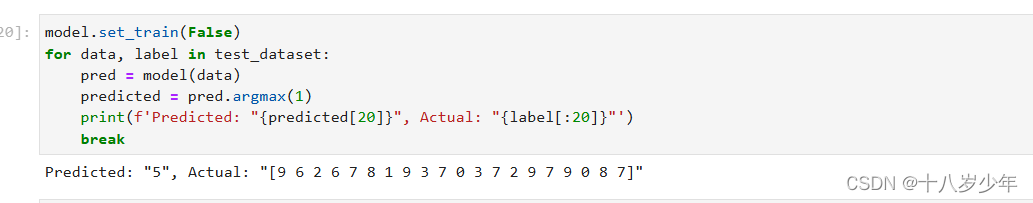 训练过程需多次迭代数据集,一次完整的迭代称为一轮(epoch)。在每一轮,遍历训练集进行训练,结束后使用测试集进行预测。打印每一轮的loss值和预测准确率(Accuracy),可以看到loss在不断下降,Accuracy在不断提高。