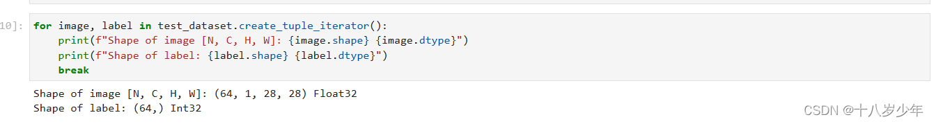 可使用create_tuple_iterator 或create_dict_iterator数据集进行迭代访问,查看数据和标签的shape和datatype。