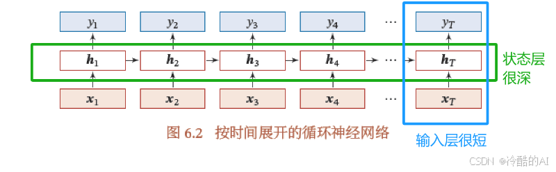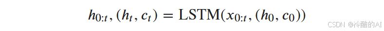 Time step:在循环神经网络计算的每一次循环,成为一个Time step。在送入文本序列时,一个Time step对应一个单词。因此在本例中,LSTM的输出ℎ0:𝑡对应每个单词的隐状态集合,ℎ𝑡和𝑐𝑡对应最后一个单词对应的隐状态。