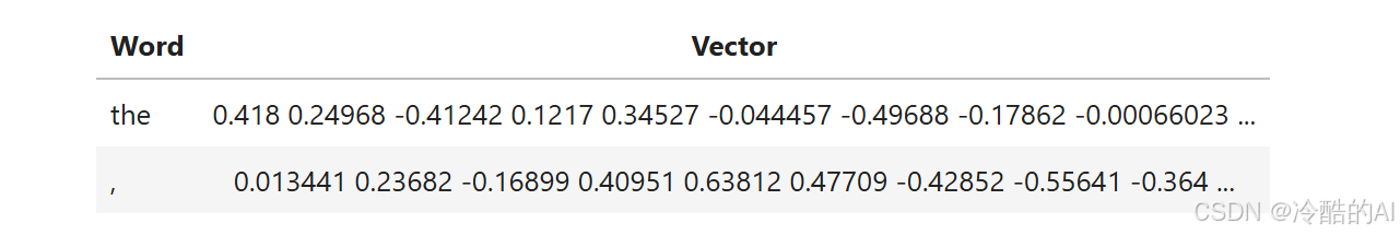 预训练词向量是对输入单词的数值化表示,通过nn.Embedding层,采用查表的方式,输入单词对应词表中的index,获得对应的表达向量。 因此进行模型构造前,需要将Embedding层所需的词向量和词表进行构造。这里我们使用Glove(Global Vectors for Word Representation)这种经典的预训练词向量, 其数据格式如下: