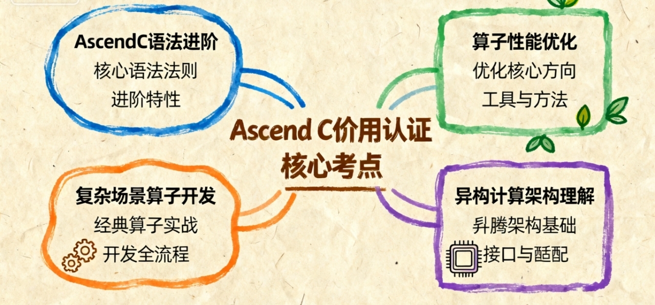Ascend C中级认证聚焦算子开发全流程能力,需先明确核心考点框架(如图1所示),避免盲目复习。核心考点包括Ascend C语法进阶、算子性能优化、复杂场景算子开发(如Erf、LogsoftmaxV2等经典算子)、异构计算架构理解四大模块。