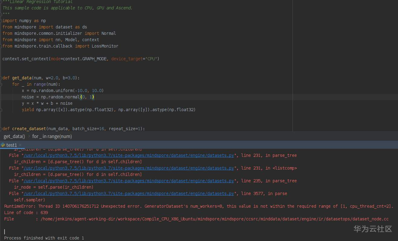 此案例运行官网的线型函数拟合示例,此前已成功安装mindspore。