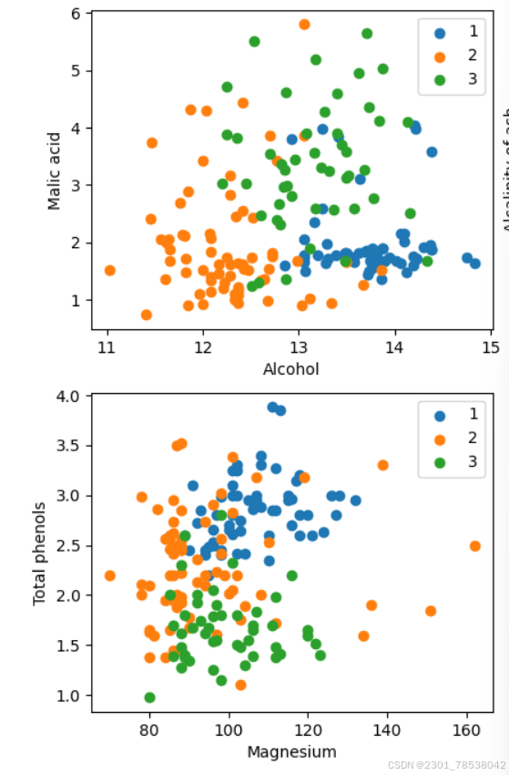 attrs = ['Alcohol', 'Malic acid', 'Ash', 'Alcalinity of ash', 'Magnesium', 'Total phenols','Flavanoids', 'Nonflavanoid phenols', 'Proanthocyanins', 'Color intensity', 'Hue','OD280/OD315 of diluted wines', 'Proline']