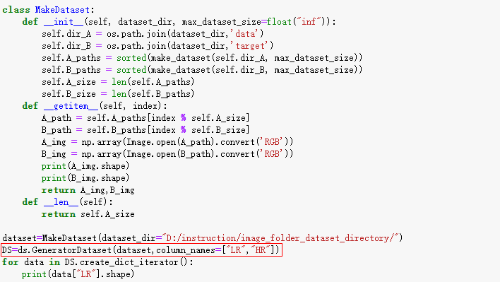 DS=ds.GeneratorDataset(dataset,column_names=["LR,HR"]) 改为与输入数据返回字段相匹配的形式: DS=ds.GeneratorDataset(dataset,column_names=["LR","HR"])