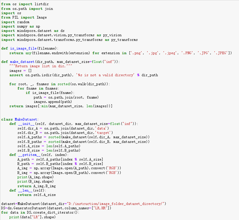 此案例为创建一个做超分辨率的数据集,使用mindspore.dataset.GeneratorDataset接口实现自定义方式的进行数据集加载。