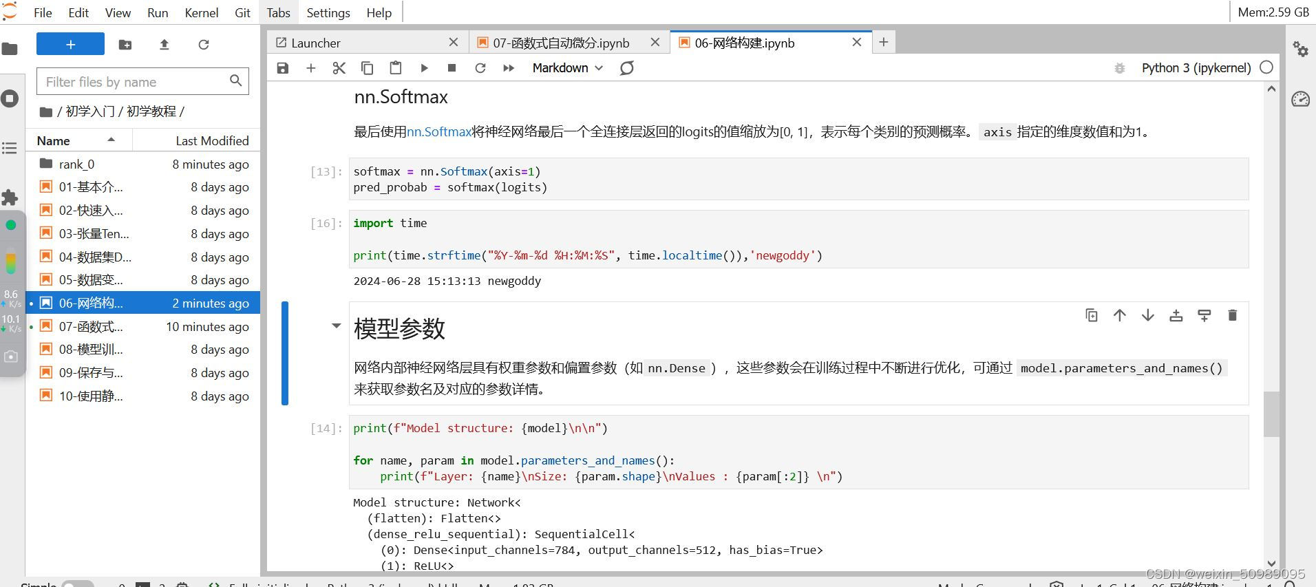 使用mindspore的模块进行网络模型构建,主要是nn的各种网络定义,操作还是很方便的,和pytorch的构建类似,定义模型,构建网络层,激活函数等,最后查看模型参数