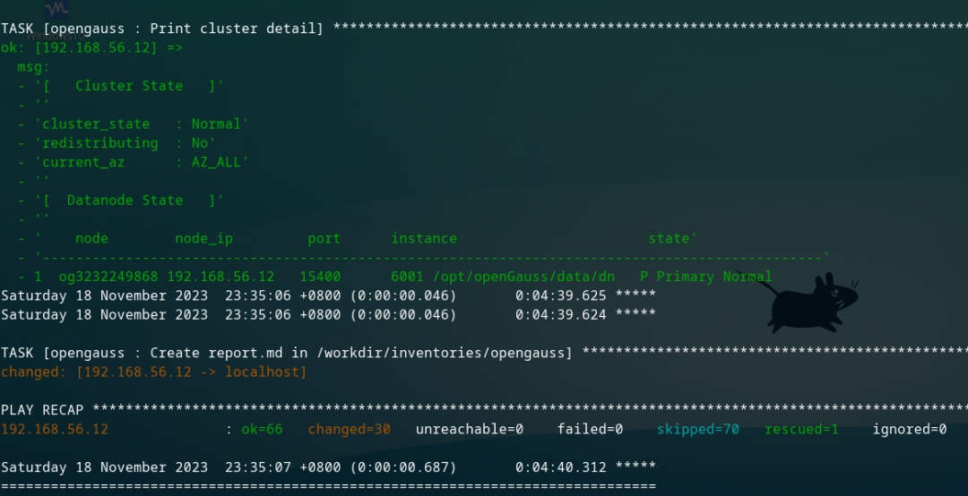 Saturday 18 November 2023 20:54:50 +0800 (0:00:06.777) 0:01:03.288 *****TASK [opengauss : Config MTU in /etc/sysconfig/network-scripts/ifcfg-enp0s8] *****************************************************************************************************************changed: [192.168.56.11]changed: [192.168.56.14]changed: [192.168.56.15]Saturday 18 November 2023 20:54:50 +0800 (0:00:00.517) 0:01:03.807 *****
