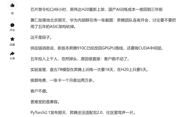 毕竟在此之前H20刚刚恢复对华销售并获得互联网市场追捧,事件背景明显带有一定市场压力因素。而且昇腾只是要在GPGPU新赛道重新起步,即便能成功落地,现在也远远未到出成果的时候。