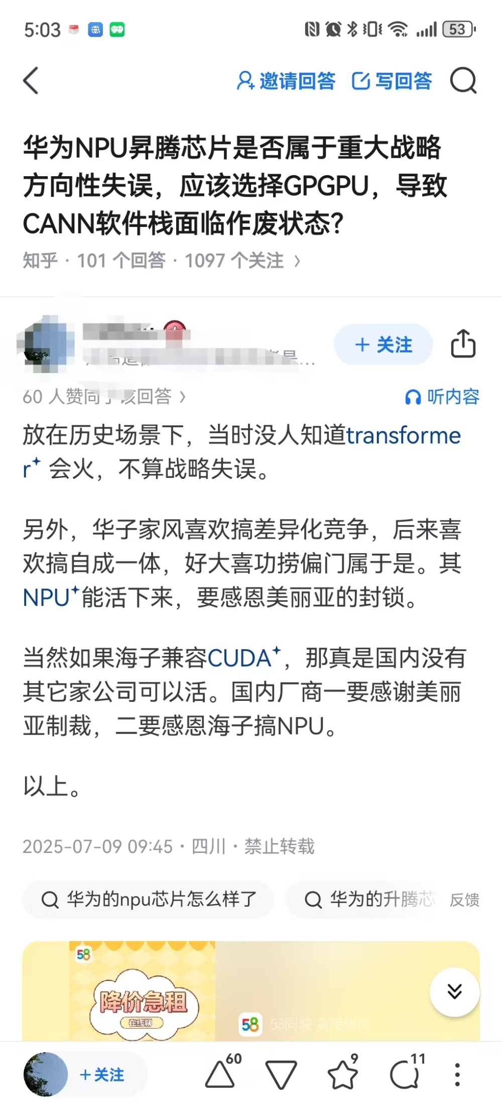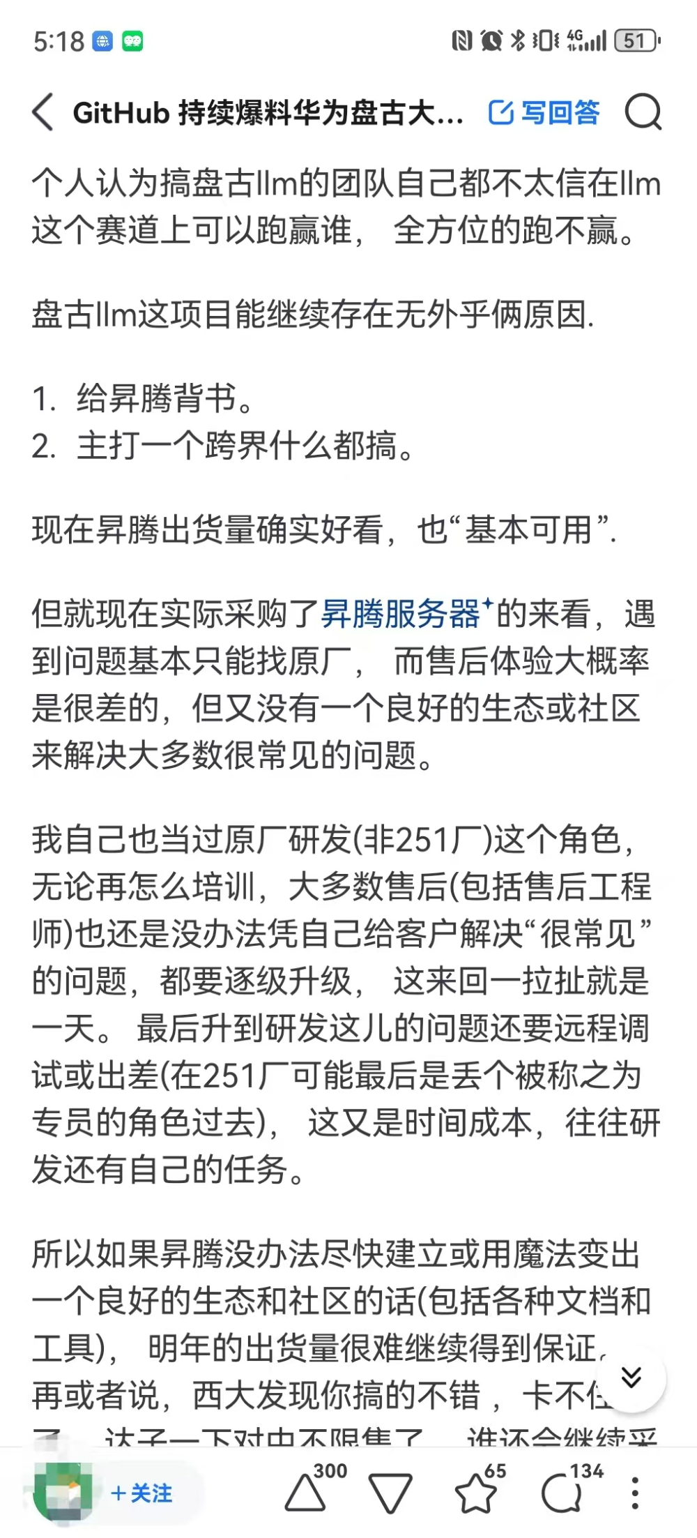 而在“昇腾NPU是否属于战略失误”话题中,有人认为当时大家预料不到trsnsforme会火。后边NPU能够获得发展主要在于美国的技术封锁,以及“华子家”的差异化竞争和自成一体等模式,属于“好大喜功捞偏门”。