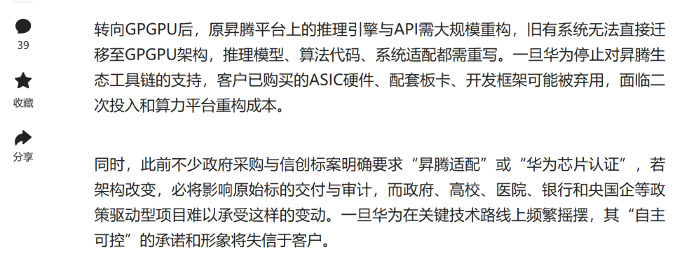 据分析称,从ASIC转向GPGPU后,原昇腾平台上的推理引擎与API需要大规模重构,旧有系统无法直接迁移至GPGPU架构,推理模型、算法代码、系统适配都需重写。