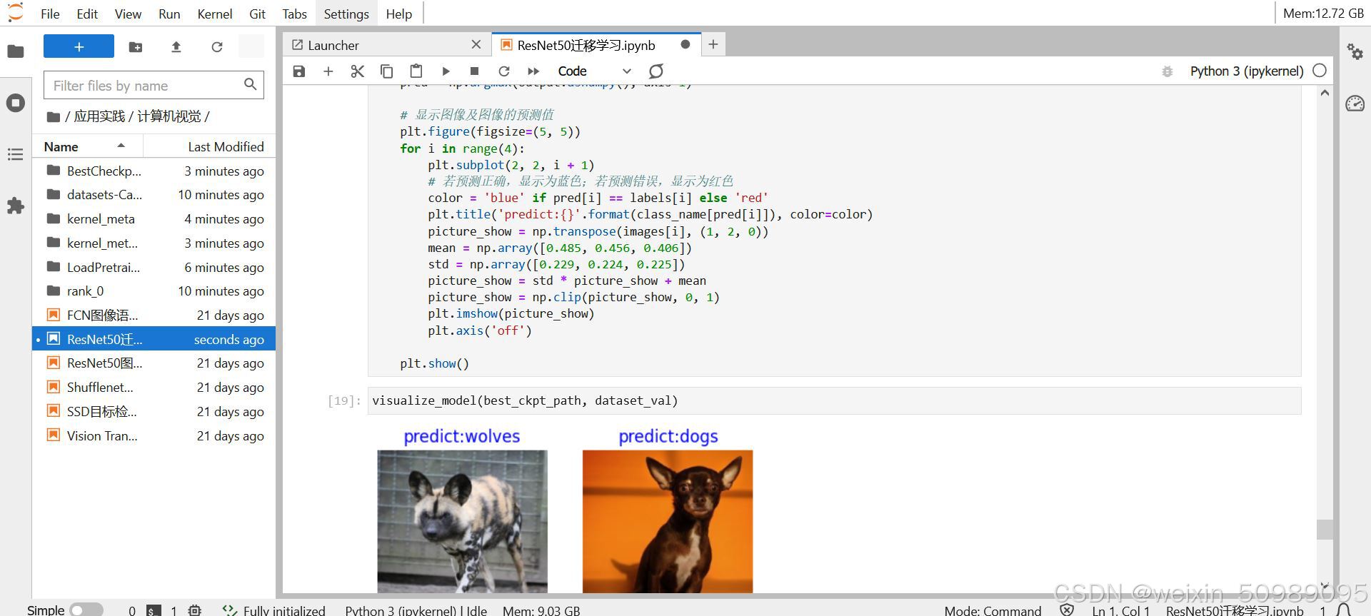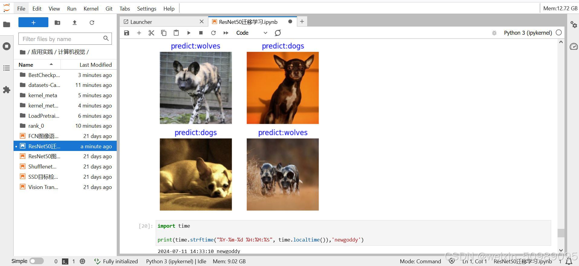 此案例的学习内容是通过resnet50来进行狗图片的分类,预训练模型的参数也已经提供,计算机视觉中的应用还是很多的,结合场景内容来学习的话,可能会更有意思些吧,训练过程中速度也比较快,预测dogs or wolves,还是挺有趣的