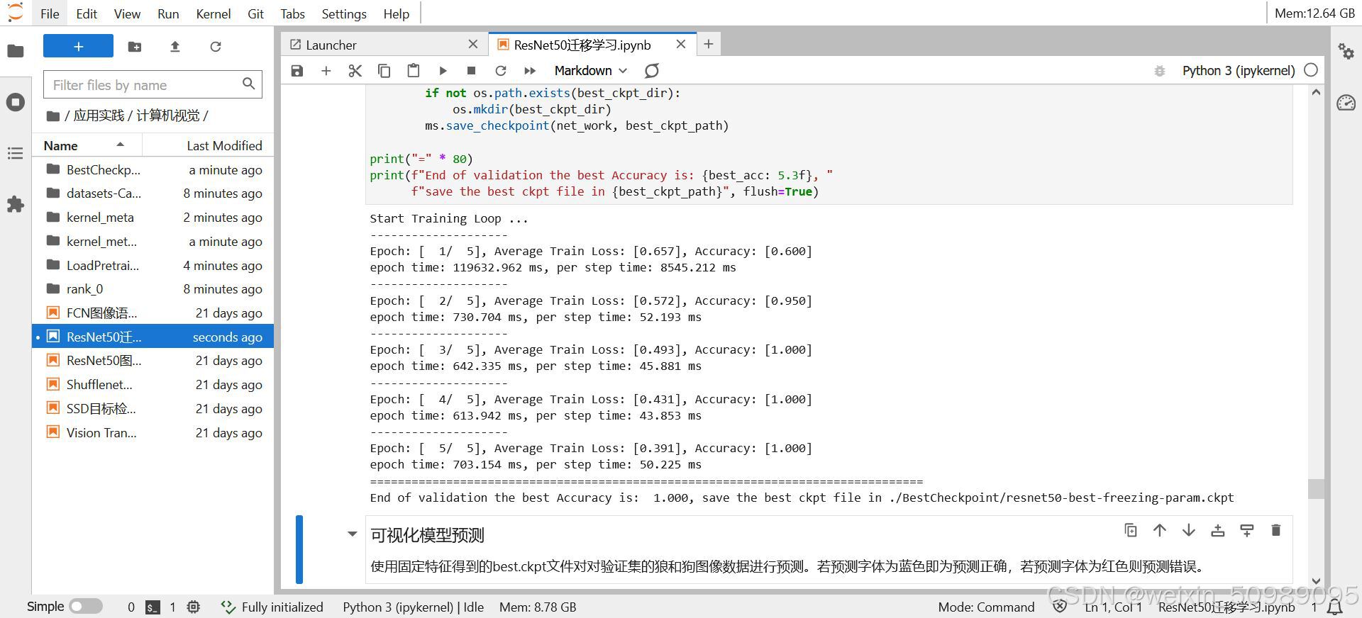 此案例的学习内容是通过resnet50来进行狗图片的分类,预训练模型的参数也已经提供,计算机视觉中的应用还是很多的,结合场景内容来学习的话,可能会更有意思些吧,训练过程中速度也比较快,预测dogs or wolves,还是挺有趣的。ResNet50迁移学习。昇思大模型使用第十八天。