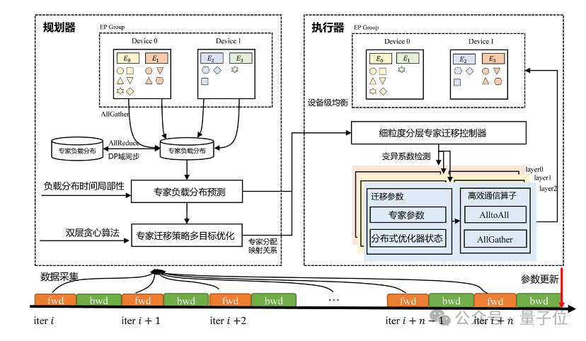 MoE模型训练中,设备间的专家负载不均衡如同“跷跷板”——部分设备满载运行,另一些却处于“半休眠”状态。团队提出了基于多目标优化的专家动态迁移技术,让专家在分布式设备间“智能流动”。