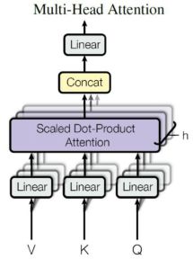 从上图可以看出Multi-Head Attention由多个Self-Attention层,首先将输入X分别传递到h个不同的Self-Attention中,计算得到h个输出矩阵Z。Multi-Head Attention 将h个矩阵Z拼接在一起,然后传入一个Linear层,得到Multi-Head Attention最终的输出Z。