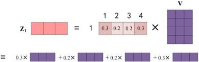 计算最终的输出Z值:最终词1的输出等于所有单词i的值根据自注意力系数的比例加在一起得到,如下图所示。