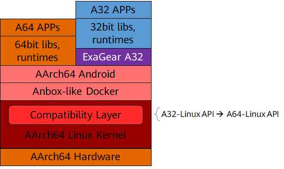 场景二:Android应用ExaGear支持Android A32应用在AArch64平台上的转码运行。这需要重新编译内核以启用兼容层。通过这种方案,Android A32应用可以在Arm64平台上得到支持和运行,扩大了应用的兼容性和可用性。