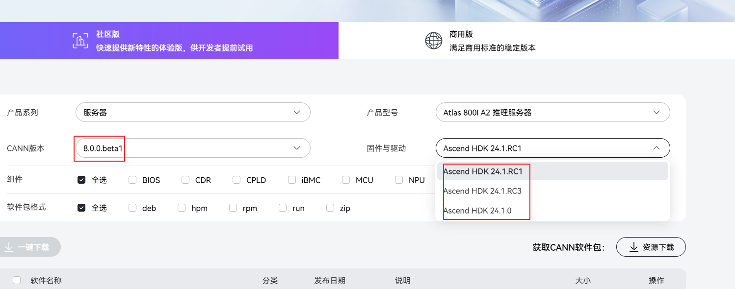 一般建议选择新版本CANN和固件驱动,固件驱动有多个兼容版本,建议选最新版本。(可以根据软件发布时间来判断版本的新旧)