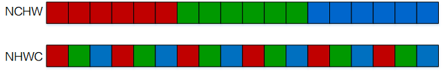 以一张格式为RGB的图片为例,NCHW中,C排列在外层,实际存储的是“RRRRRRGGGGGGBBBBBB”,即同一通道的所有像素值顺序存储在一起;而NHWC中C排列在最内层,实际存储的则是“RGBRGBRGBRGBRGBRGB”,即不同通道的同一位置的像素值顺序存储在一起。