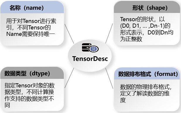 - 张量描述符(TensorDesc)是对输入数据与输出数据的描述,主要包含如下属性: