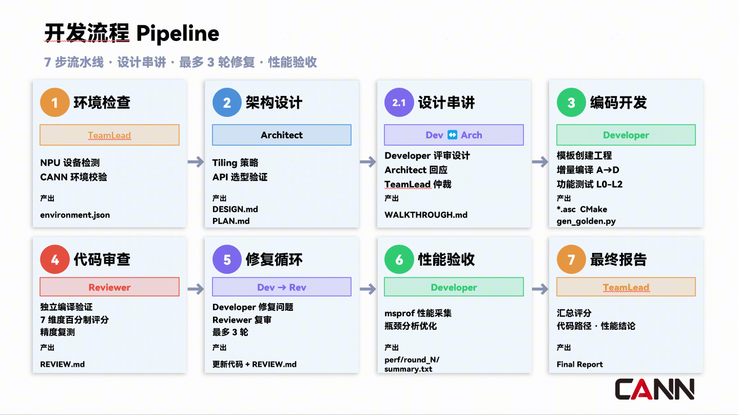 作为面向CANN开发的智能助手,CANNBot实现了16个Skills模块,覆盖Ascend C算子开发全流程。通过Agent驱动的7阶段工作流,自动完成方案设计、代码编写、质量审查,将开发周期从天级缩短到小时级。