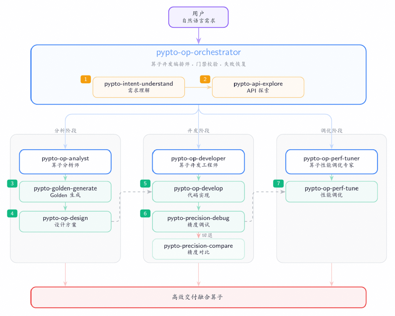 CANNBot PyPTO Agent 基于 CANNBot 智能体平台与 PyPTO 高性能编程框架构建,将资深 PyPTO 算子开发工程师经验封装为可编排的标准化 Skill,实现从需求到交付的全流程自动化。在昇腾 AI 生态中,融合算子开发涉及编码、精度与性能调优等环节,传统模式周期长、高度依赖专家经验。本方案将最佳实践固化为 7 个标准化 Skill,通过 4 个专业 Agent 协同,构建端到端自动化流程,解决开发效率低、门槛高的痛点,保障开发规范与高效。本期将以 QAT Symmetric Per-Tensor 算子为例,使用CANNBot PyPTO Agent实现全流程开发,自动生成符合 PyPTO 规范的融合算子实现,定位修复精度问题,并迭代优化性能,大幅缩短开发周期,实现算子开发自动化与高效化。
