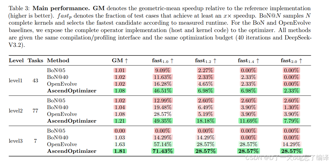 3. Qwen3-235B 在 CUDA 上 44.2%,在 AscendC 上 0.7%。