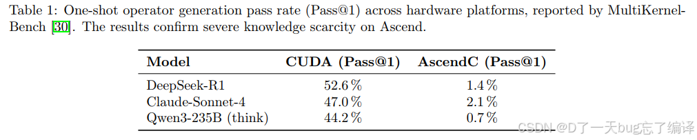 文章在引言里借 Table 1 强调了一件事:通用甚至前沿模型在 CUDA 上还能做出像样结果,但在 AscendC 上几乎崩掉。