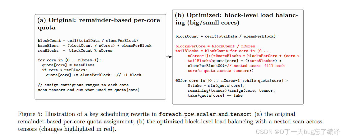 Figure 5 把其中一个关键 rewrite 展开:从 remainder-based per-core quota assignment 改成 block-level load balancing + nested scan across tensors。