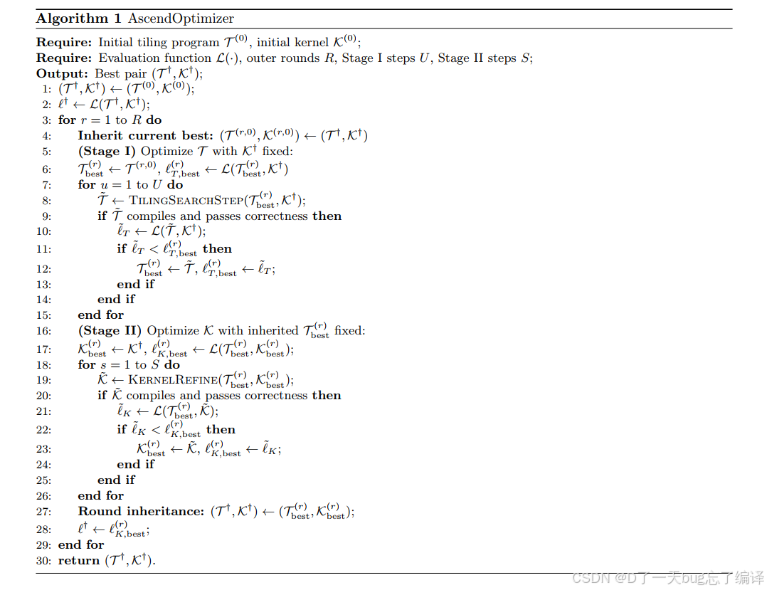 Algorithm 1 的本质,是一个面向 Ascend 算子的交替优化框架:外层循环逐轮继承当前最优解,内层先在固定 kernel 下搜索更优 tiling,再在固定 tiling 下重写更优 kernel,并通过真实硬件上的编译、正确性和延迟反馈来筛选候选,最终得到联合优化后的最优实现。